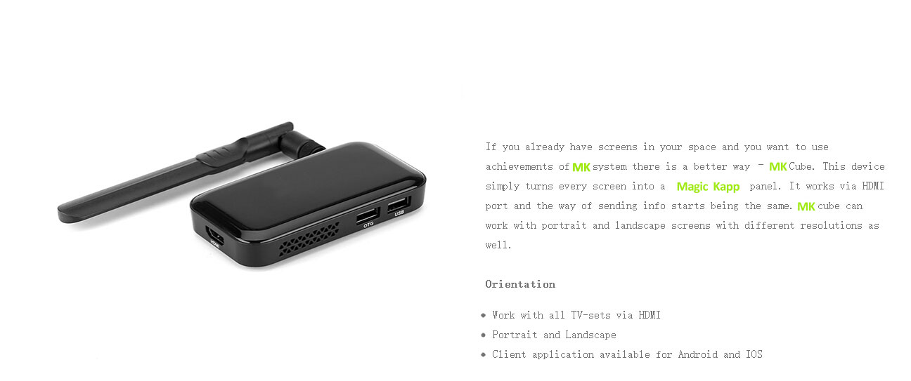 Magic Kapp is a built-in solution for showing advertisements everywhere. If you already have some TV screens or panels you can just use Magic Kapp Cube to transfer your advertisements on them. Magic Kapp Cube is Set Top TV dongle with HDMI out and our software on it.
